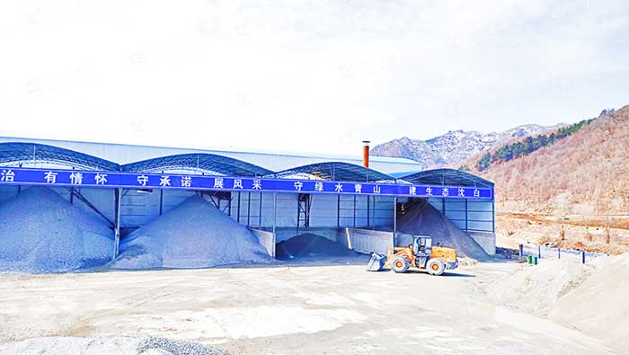該生產線原料為洞渣加工碎石、從破碎制砂、篩分水洗、污水零排放、儲存,各環節均采用全封閉式結構,收塵管道布置于系統各處揚塵點,避免粉塵外溢,實現環 保生產。